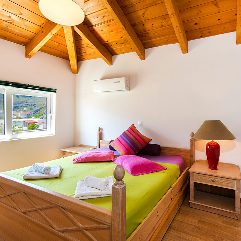 Upstairs there is a spacious bathroom with one double bed bedroom, a bedroom with single two beds and a family room with three single beds.
