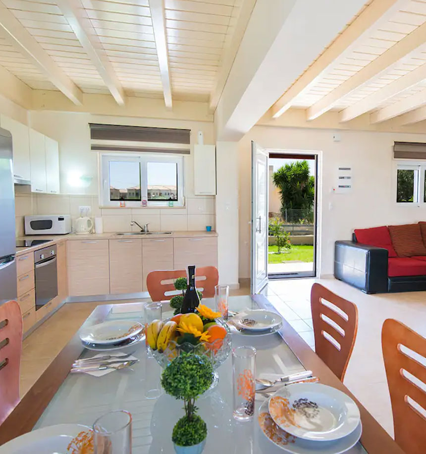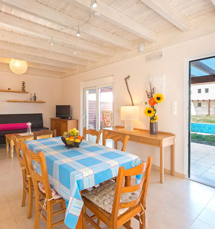 The villa is located near the sea and on walking distance of everything you need for a nice holidays and a comfortable stay. Build on 9000 sqm, the semi-detached villas surround a 125 sqm swimming pool. Aircondition on the ground floor & bedrooms. There are patios in the front and on the back of the house and the rest of the land is green grass and some olive trees with mountain view. There is a private road that passes in front of the house, where you can park your car.