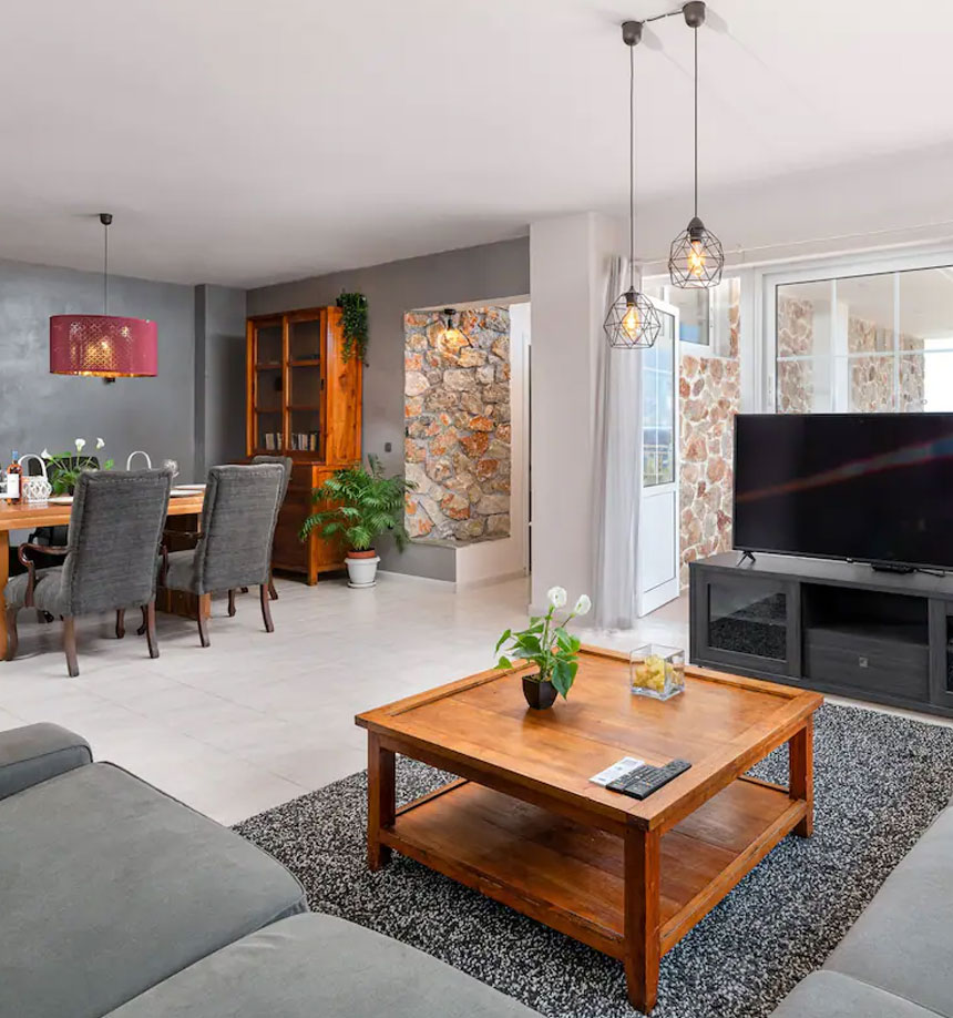 Theis modern Greek-style villa is only 300m from the beach and with a beautiful view of the surrounding mountains. Cozy semi-detached house with modern comforts and a big common swimming pool. Everything you need is on a walking distance!