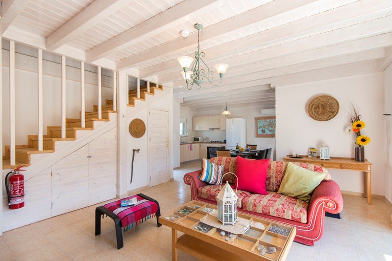 Upstairs there are 3 double bedrooms and a spacious bathroom. The house is brand new with all its comfort. The wooden ceilings and the furniture make it a cosy and pleasant place to stay.