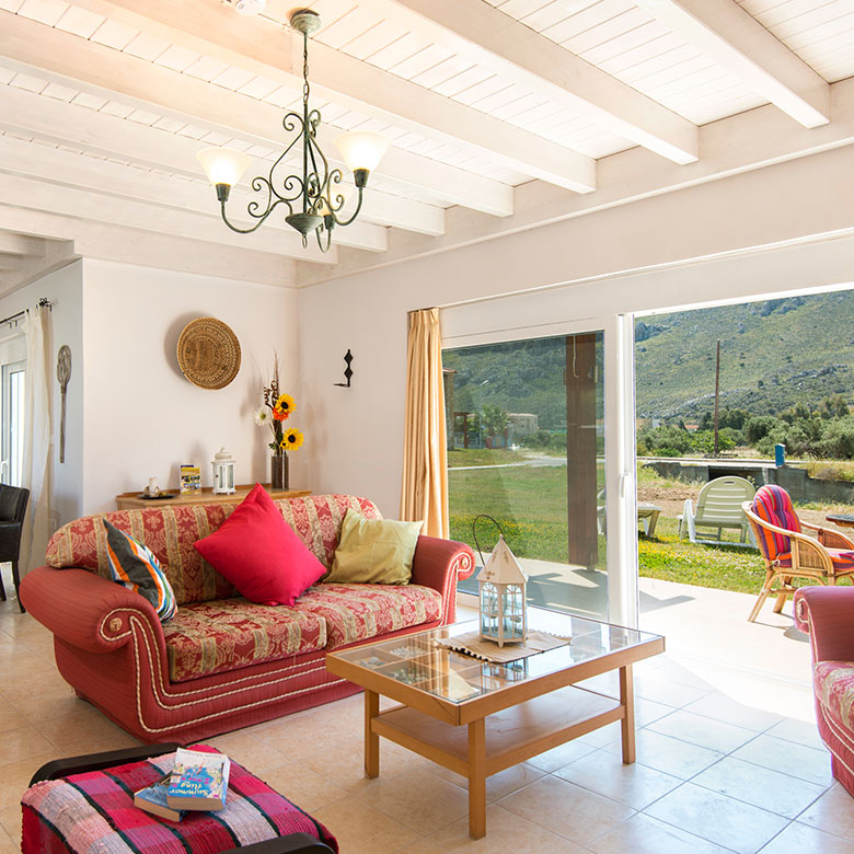 The villa is located near the sea and on walking distance of everything you need for a nice holidays and a comfortable stay. Build on 9000 sqm, the semi-detached villas surround a 125 sqm swimming pool. Aircondition on the ground floor & bedrooms. There are patios in the front and on the back of the house and the rest of the land is green grass and some olive trees with mountain view. There is a private road that passes in front of the house, where you can park your car.